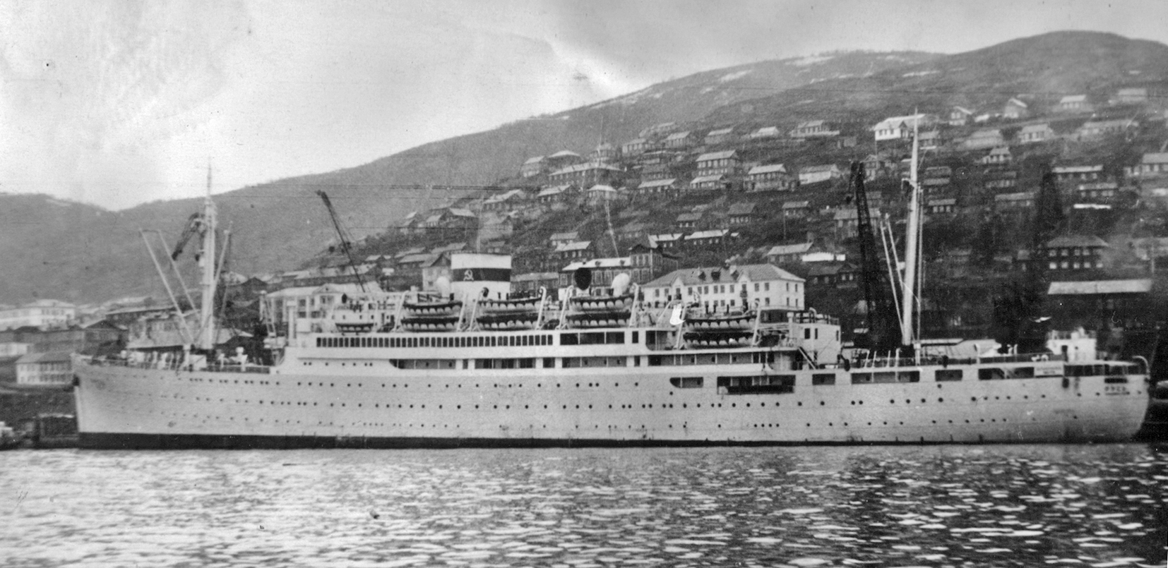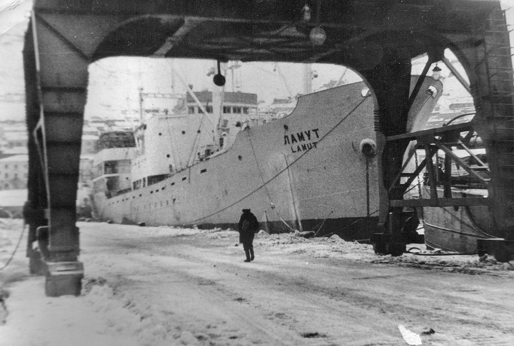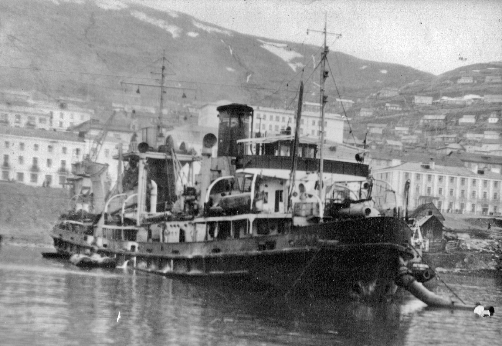 3. Пароход "Брянск" типа "Либерти" в Петропавловске. Построен в 1944 г. в США для перевозки грузов по ленд-лизу. (Тому самому, по которому тогда возили снабжение и вооружение для Красной Армии во время войны с нацизмом. А вовсе не тому ленд-лизу, объявленному недавно нашими былыми союзниками для помощи потомкам тех самых недобитых нацистов.) Принадлежал ДВГМП, затем передан в распоряжение Дальрыбы (из собрания А. А. Пирогова)