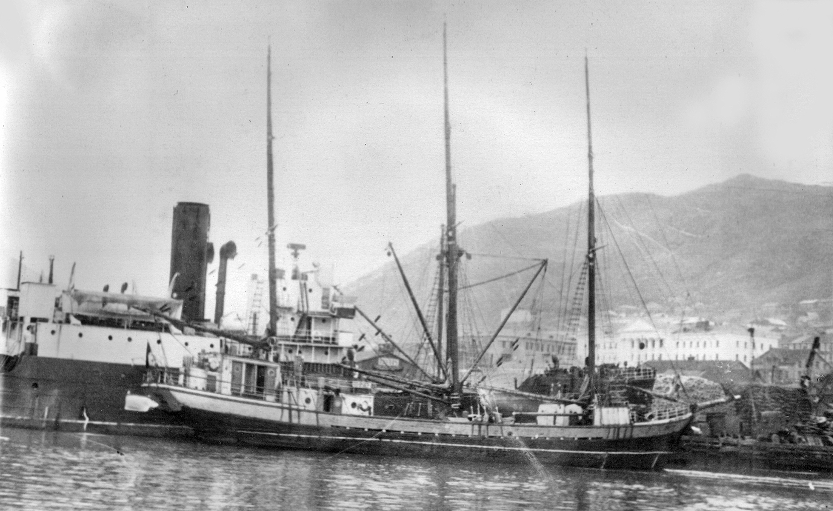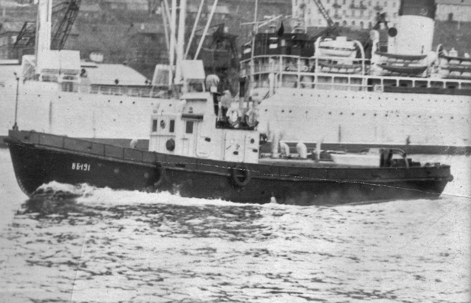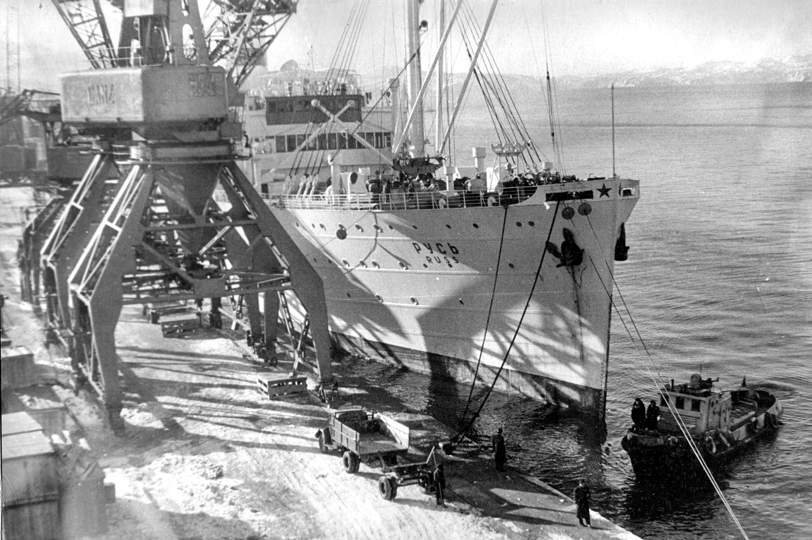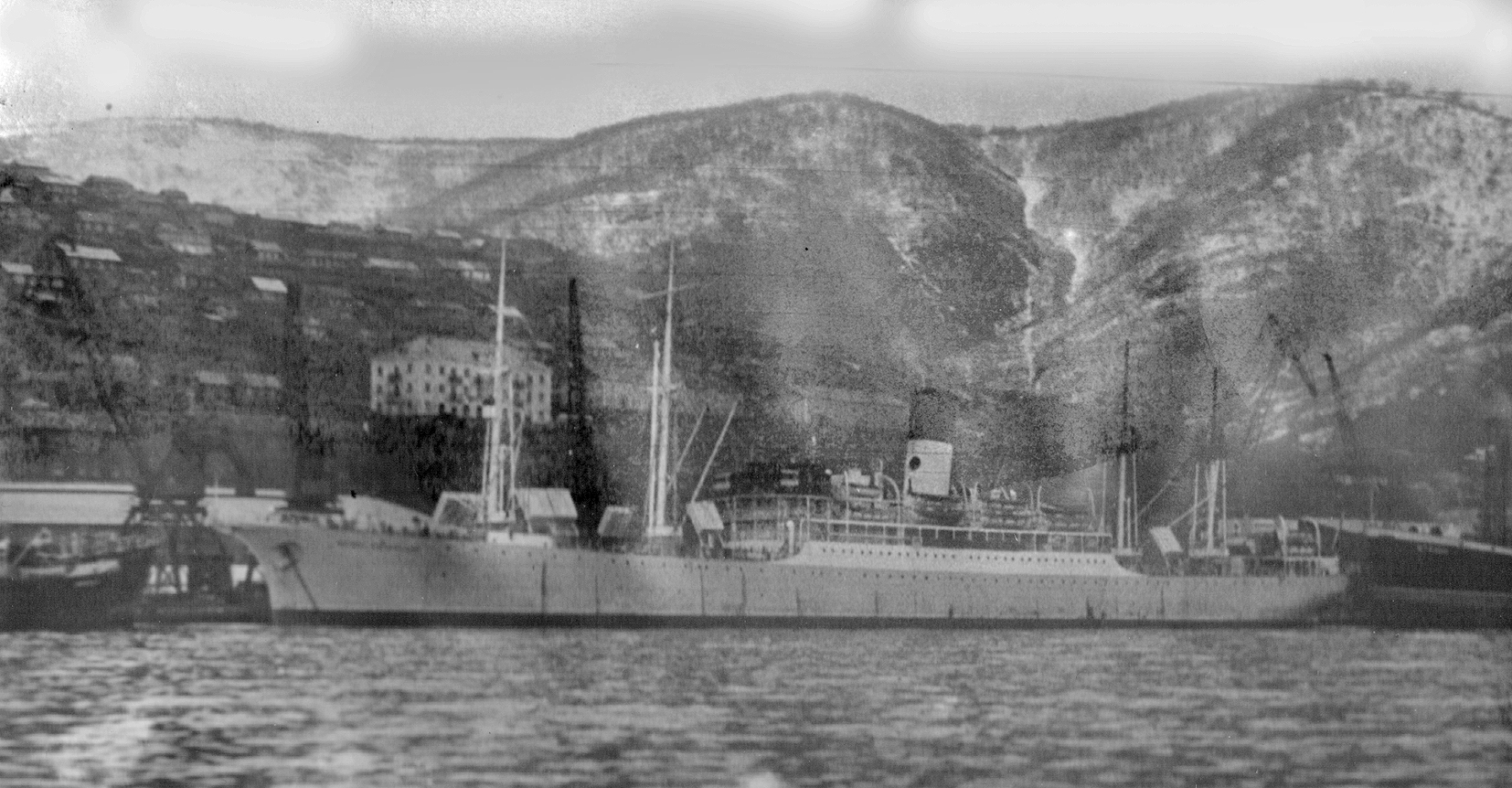 3. Пароход "Брянск" типа "Либерти" в Петропавловске. Построен в 1944 г. в США для перевозки грузов по ленд-лизу. (Тому самому, по которому тогда возили снабжение и вооружение для Красной Армии во время войны с нацизмом. А вовсе не тому ленд-лизу, объявленному недавно нашими былыми союзниками для помощи потомкам тех самых недобитых нацистов.) Принадлежал ДВГМП, затем передан в распоряжение Дальрыбы (из собрания А. А. Пирогова)