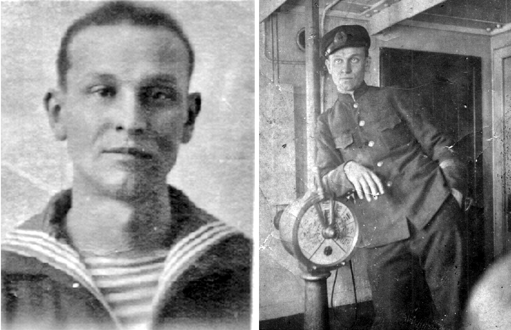 180. А. Е. Мамонтов после призыва в Военно-Морской Флот, 20 января 1943 г. (слева). Он же на мостике одного из траулеров АКО во время Великой Отечественной войны (из собрания А. Е. Мамонтова)