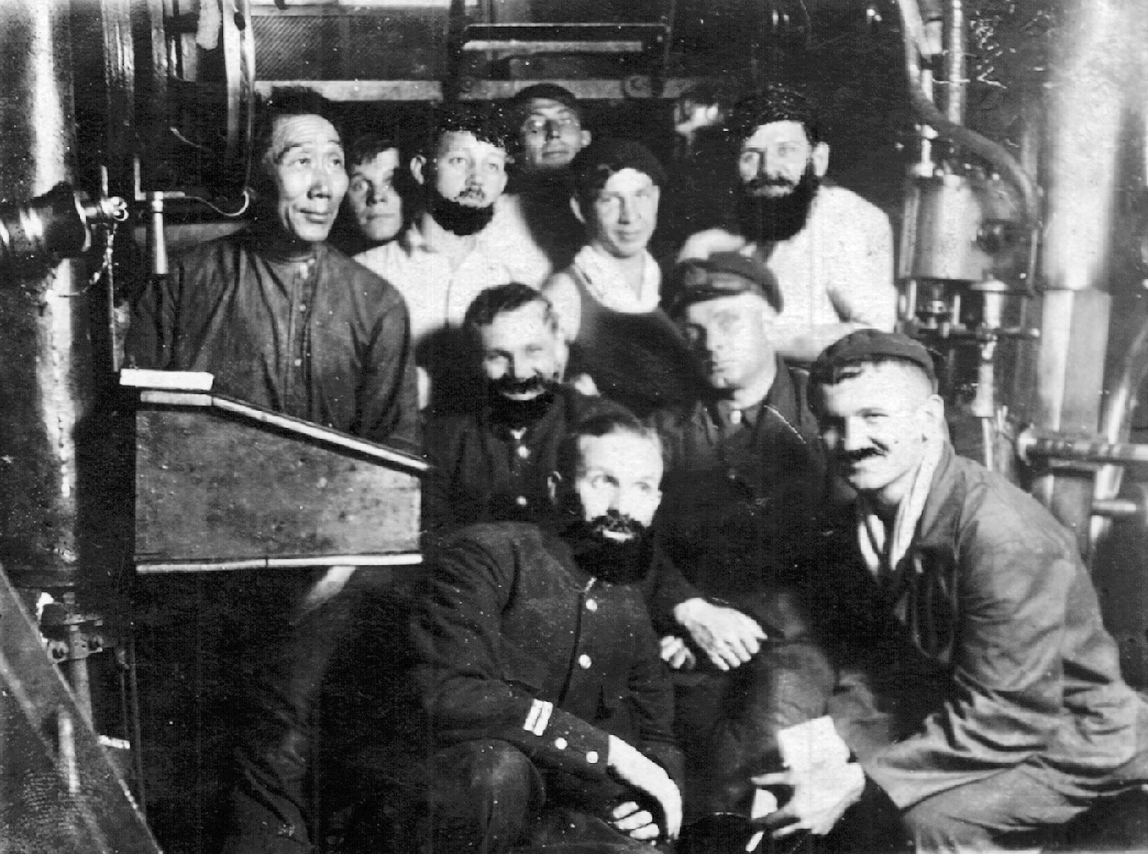 182. В машинном отделении траулера АКО в годы войны. Кто-то, видимо, в шутку, пририсовал некоторым морякам густые бороды (из собрания А. Е. Мамонтова)
