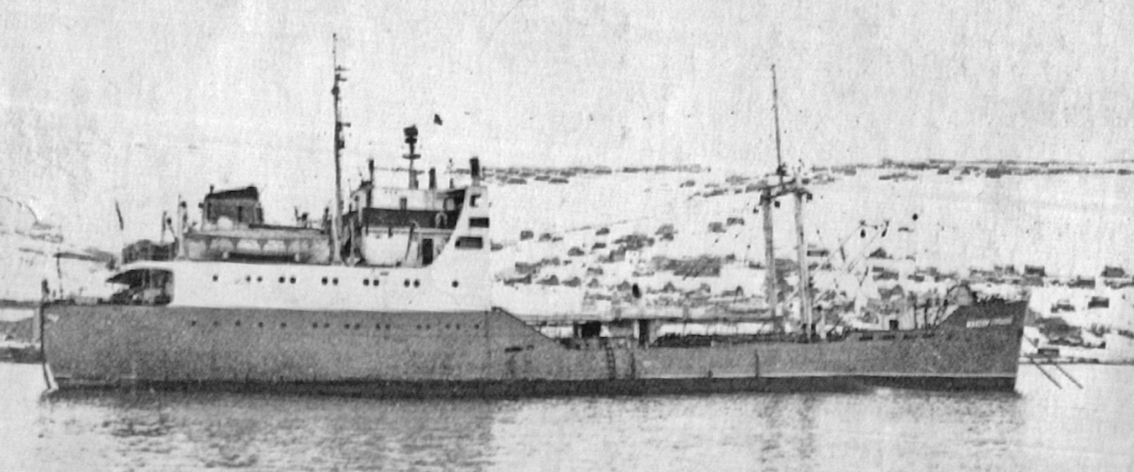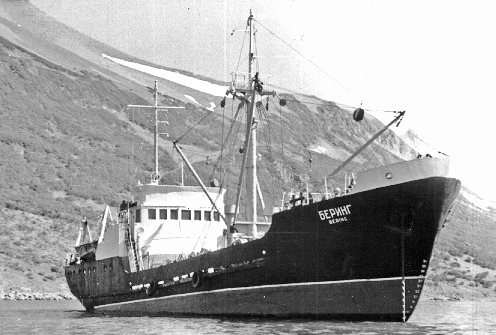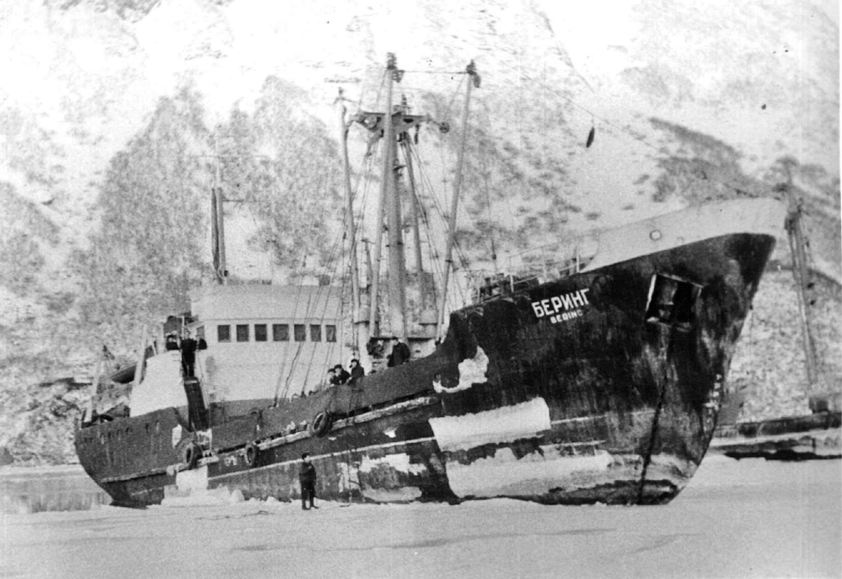 50. Теплоход Камчатрыбфлота "Беринг" (типа "Тисса") в бухте Лаврова, октябрь 1961 г. (из собрания Г. Б. Рогозина)