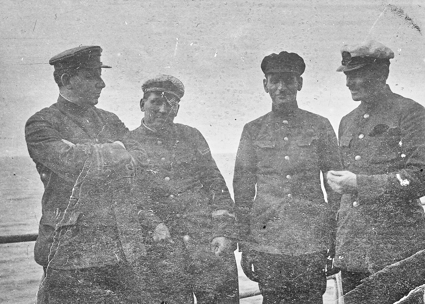 200. Слева — экипаж «Щорса», капитан В. П. Зеньков. Справа — штурманы Владимир Брагин и Тимофей Кривоногов, около 1953 г. (из собрания Т. М. Кривоногова)