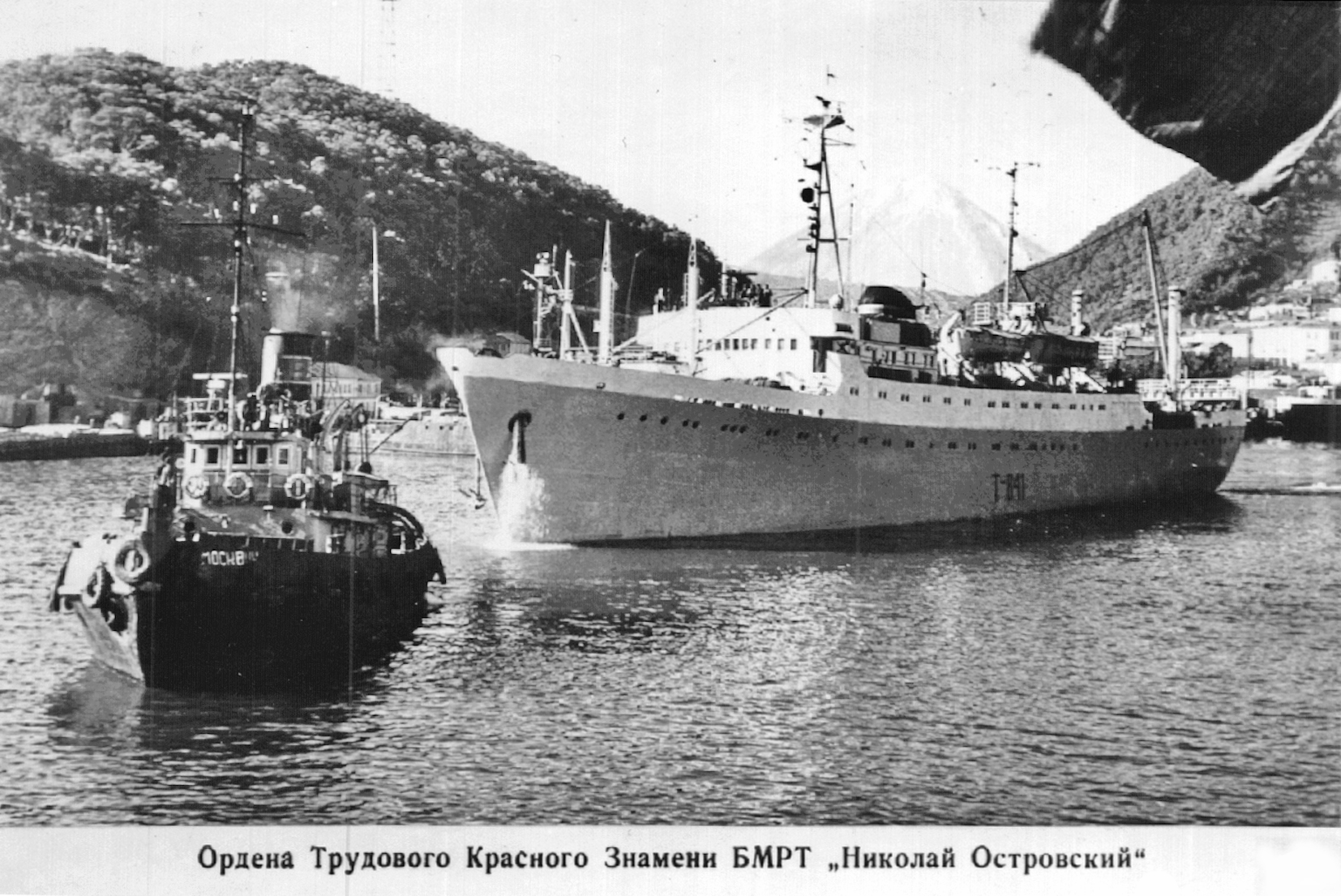 129. Первый в стране орденоносный БМРТ "Николай Островский" и буксир "Москвич" в Петропавловском морском рыбном порту, середина 1960-х гг. (из собрания В. Г. Очеретина)