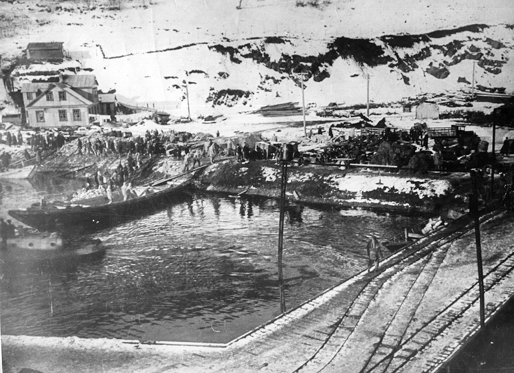 133. Разработка территории порта. Справа — единственный деревянный причал с узкоколейной железной дорогой (декавилькой), 1930-е гг. (из собрания В. Г. Очеретина)