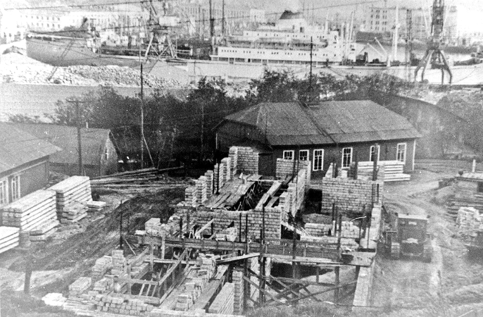 135. Строительство в порту навигационной камеры. На заднем плане — плавбаза УТРФ Камчатрыбпрома "Советская Камчатка", начало 1960-х гг. (из собрания В. Г. Очеретина)