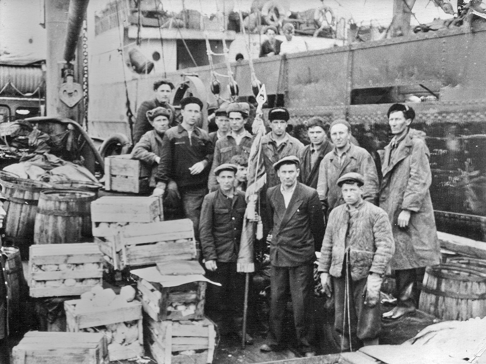 102. Экипаж СРТ-4336 Управления тралового флота Главкамчатрыбпрома с переходящим Красным знаменем Петропавловского городского комитета КПСС, июль 1957 г. В центре — капитан А. Н. Моисеев (из собрания Ю. А. Моисеева)