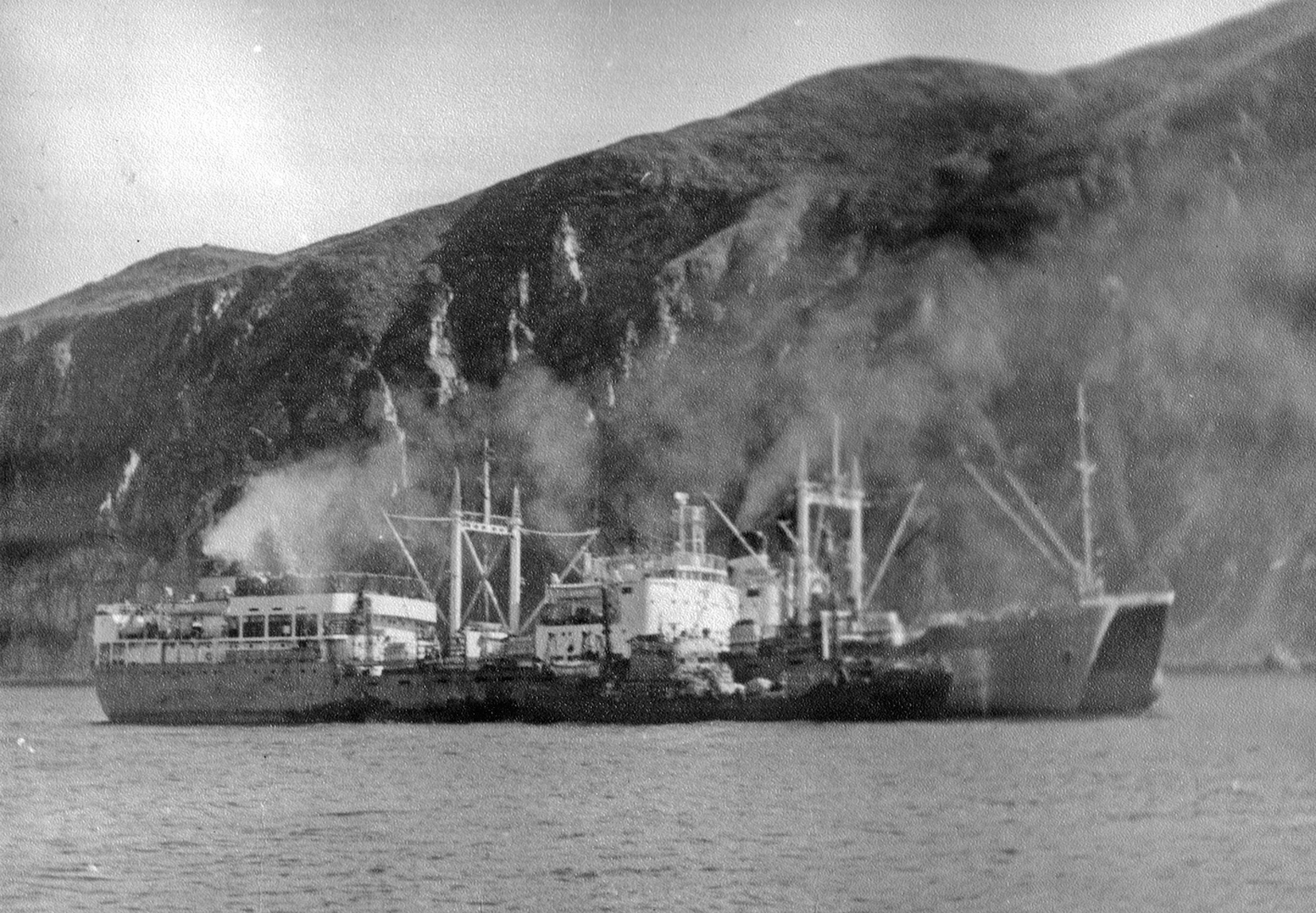 92. Гибель парохода "Капитан Чириков" (построен в 1949 г.) в бухте Ольга (Кроноцкий залив) 13 апреля 1953 г. (из собрания Ю. А. Моисеева)