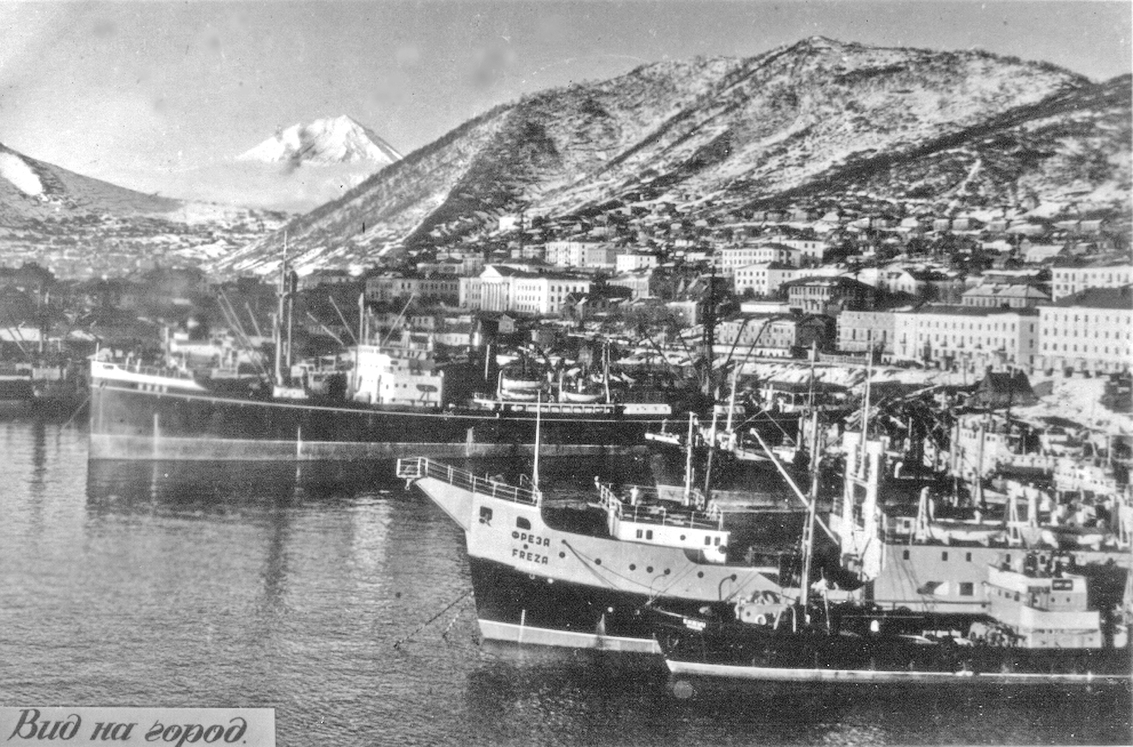 75. Фотооткрытка. Вид на город и рыбный порт. На переднем плане — судоремонтная плавмастерская "Фреза", в центре — пароход "Кулу" (из собрания Ю. А. Моисеева)