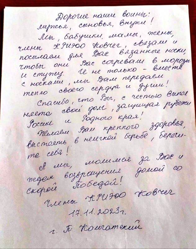 На этот раз «ковчеговцы» через Андрея Сергеевича передали в зону СВО около тридцати пар шерстяных носков и письмо со словами поддержки.