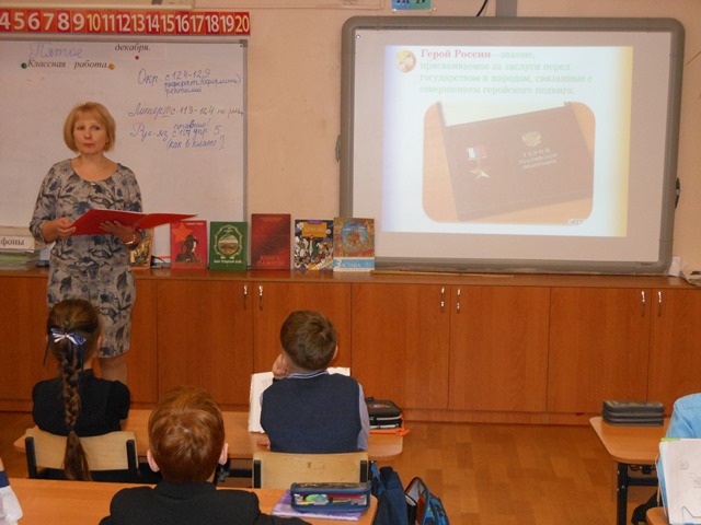 Час памяти "Россия не забудет своих героев" познакомил учащихся четвертых классов средней школы №24 с историей праздника День героев Отечества и со знаменитыми героями прошлого. Очень бурно прошло обсуждение вопроса, можно ли стать героем в мирное время, все участники хотели высказать свое мнение.