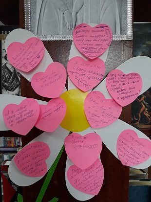 В преддверии Дня семьи, любви и верности (еще этот день называют Днем Петра и Февронии, в честь святых, которые на своем примере показали, что значит идеальная супружеская жизнь) в рамках акции библиотеки №5 «Письмо любимым» читателям было предложено написать несколько тёплых слов любви людям, без которых их жизнь была бы пустой. Откликнулись многие. И теперь на импровизированной ромашке – символе семьи, любви и верности – греют своим теплом всех посетителей библиотеки маленькие сердца, наполненные большой любовью к близким.