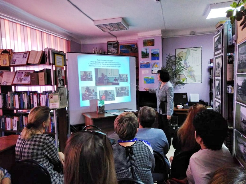 Семинар по профессиональной краеведческой библиотечной деятельности прошел 25 октября 2018 г. в библиотеке №5 для специалистов городских библиотек. Основой семинара стал отчёт о командировке на Всероссийский научно-практический семинар "Проблемы краеведческой деятельности библиотек" в г. Вологда главного библиотекаря библиотеки №5 Ирины Васильевны Кисличенко, которая представила на нём краеведческие проекты библиотек г. Петропавловска-Камчатского.