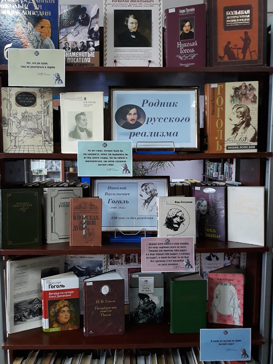 Апрель богат на литературные юбилеи, к одному из которых - 210-летию со дня рождения Николая Васильевича Гоголя - в библиотеке №5 стартовал 1 апреля цикл мероприятий для юношества. В день рождения писателя беседа для старшеклассников школы №12 прошла в форме диалога, так как включала обсуждение многочисленных гоголевских афоризмов и цитат из его бессмертных произведений, так тонко раскрывающих суть человеческого характера. В конце встречи ребята пришли к выводу, что многие из высказываний писателя крайне актуальны и в наше время, а язык произведений современен и понятен, не смотря на то, что содержит специфические слова и выражения, характерные для определённых регионов России и Украины того времени. Для всех, кто захотел поближе познакомиться с творчеством Николая Васильевича Гоголя и получить знания, выходящие за рамки школьной программы, в библиотеке №5 была подготовлена книжная выставка-портрет "Родник русского реализма", которая продолжит свою работу до 15 апреля.