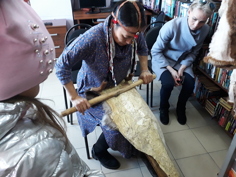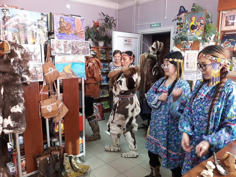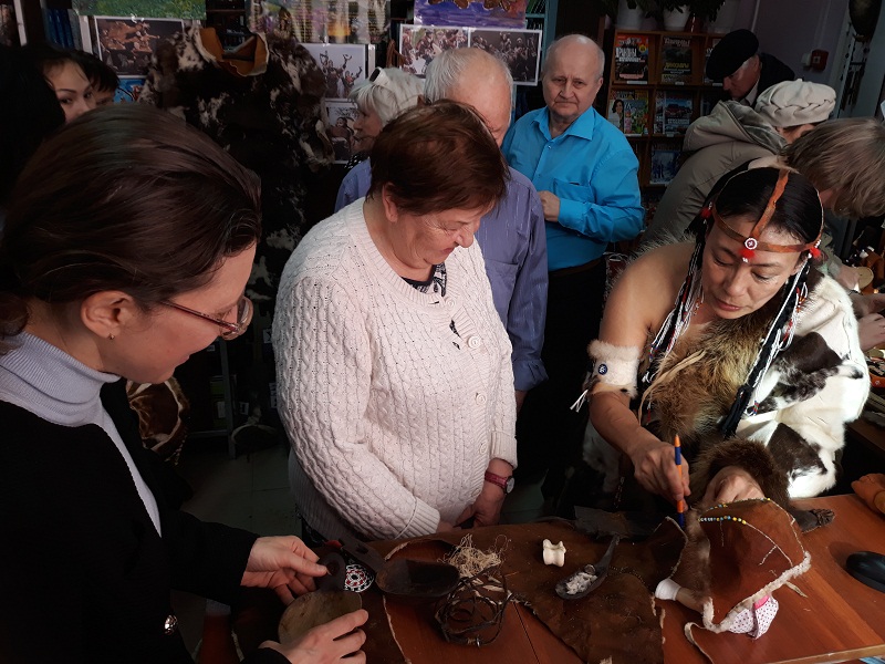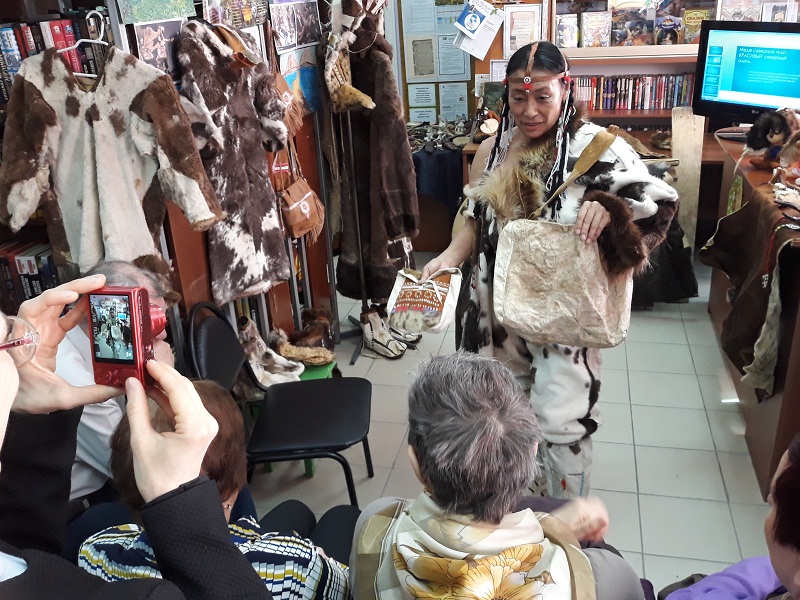 Руководитель ансамбля Лилия Александровна Аслапова - большой друг и соратник библиотеки №5 в краеведческой работе, увлекла участников вечера рассказом о жизни людей, связанных с разведением оленей, познакомила с их традициями и представлениями о мире. Экспозиция предметов быта северян позволила многим воочию увидеть, как богата культура народов, населяющих Камчатский полуостров, а проведение мастер-классов по выделке шкур дало представление о крайне тяжёлом и уникальном труде камчатских мастериц.