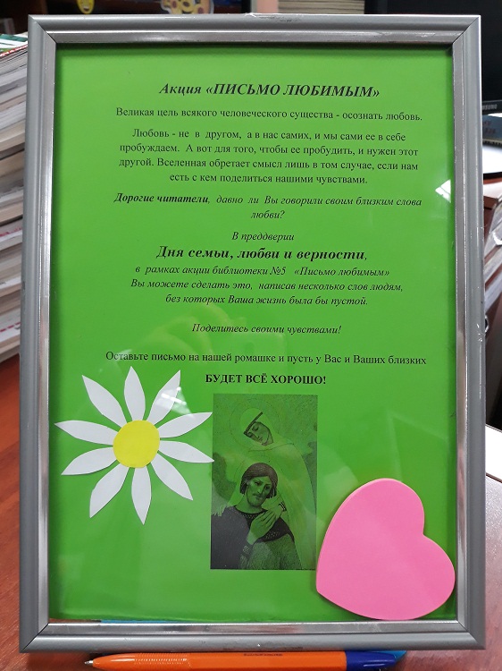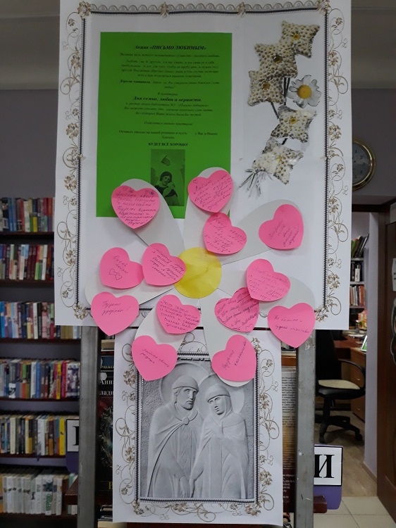 Давно ли Вы говорили своим близким слова любви? Традиционная акция к Дню семьи, любви и верности прошла в библиотеке №5. На импровизированной ромашке - символе праздника ― всем посетителям библиотеки было предложено написать несколько слов своим любимым, поделиться теплом своих чувств со своими родными и близкими, которым, в суете нашей жизни, мы крайне редко говорим об этом. Откликнулись на предложение библиотекарей очень многие, наполнив ромашку потрясающими объяснениями в любви, словами благодарности и пожеланиями здоровья и счастья, а библиотеку - атмосферой добра и душевности.
