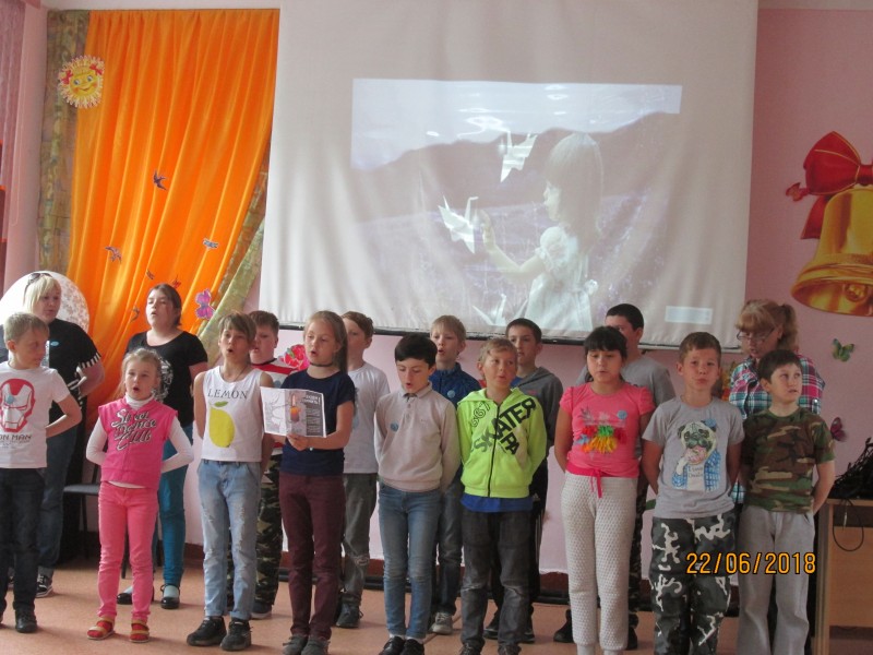 Дети пришкольного лагеря «Березка» средней школы №35 вместе с библиотекарями Библиотеки №8 и своими педагогами 22 июня 2018 года присоединились к Всероссийской акции «Свеча памяти». Более 70 детей и взрослых собрались в актовом зале школы, чтобы почтить память тех, кто защитил нашу жизнь и свободу в Великой Отечественной войне. Елена Сидорова рассказала ребятам о самых первых днях этой ужасной войны и о судьбе детей войны. Под звуки песни «Священная война» шли кадры презентации о детях, бредущих по дорогам войны, потерявших своих матерей, братьев и сестер; о детях, томящихся в лагерях смерти; о детях, вставших с оружием в руках на защиту своей Родины; о детях в тылу у станков собирающих оружие и изготовляющих боеприпасы для фронта. Эти кадры не оставили равнодушными ни одного из присутствующих: ни взрослого, ни ребенка. Каждый из трех отрядов лагеря подготовил свое выступление к этому дню. Самые младшие ребятишки исполнили песню «День без выстрела на Земле».