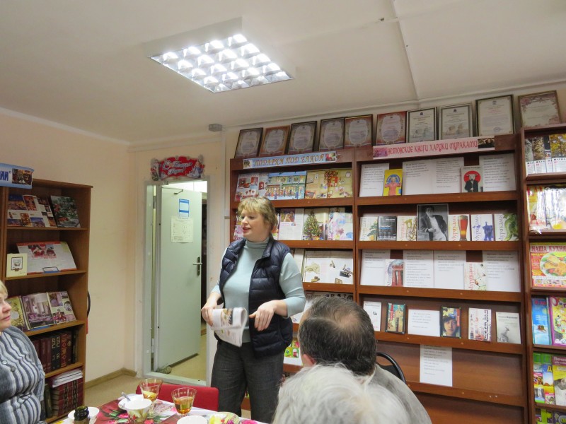 На этой встрече Стелла Федянина познакомила присутствующих с историей появления в советском меню традиционных «новогодних» блюд: оливье, селедки под шубой, салата «Мимоза», докторской колбасы, печени минтая, кальмаров, торта «Птичье молоко». Елена Сидорова рассказала о жизни и творчестве японского писателя Харуки Мураками, которому в этот день исполнилось 70 лет.