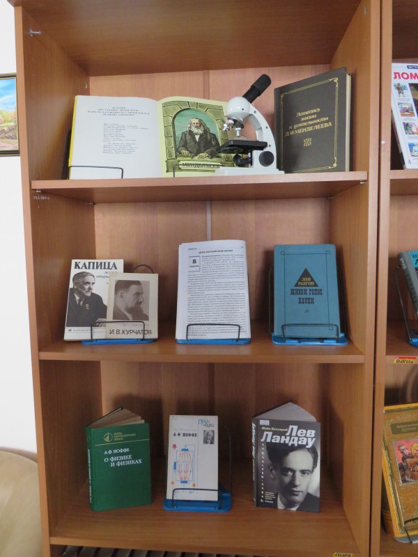 В читальном зале библиотеки № 8 5 февраля открылась книжно-предметная выставка, посвященная Дню российской науки. В экспозиции представлены биографические и энциклопедические издания, повествующие о жизни и научных открытиях выдающихся представителей различных отраслей науки: математиков, физиков, химиков, механиков, биологов, генетиков, геологов, географов, космических инженеров и многих других. Посетители выставки могут заглянуть в микроскоп, чтобы увидеть растение на срезе; вращая глобус, они могут проследить маршруты великих путешественников; невооруженным глазом рассмотреть друзу горного хрусталя. Выставка продолжит свою работу до 15 февраля. Ее можно посетить с 12 до 19 часов ежедневно, кроме воскресенья. Дню российской науки был посвящен так же познавательный час, проведенный С.В. Федяниной в 4 классе средней школы № 35 8 февраля. Особое внимание было уделено автору периодической системы химических элементов Д.И. Менделееву, 185-летие которого отмечается в феврале. Это мероприятие посетило 17 человек.