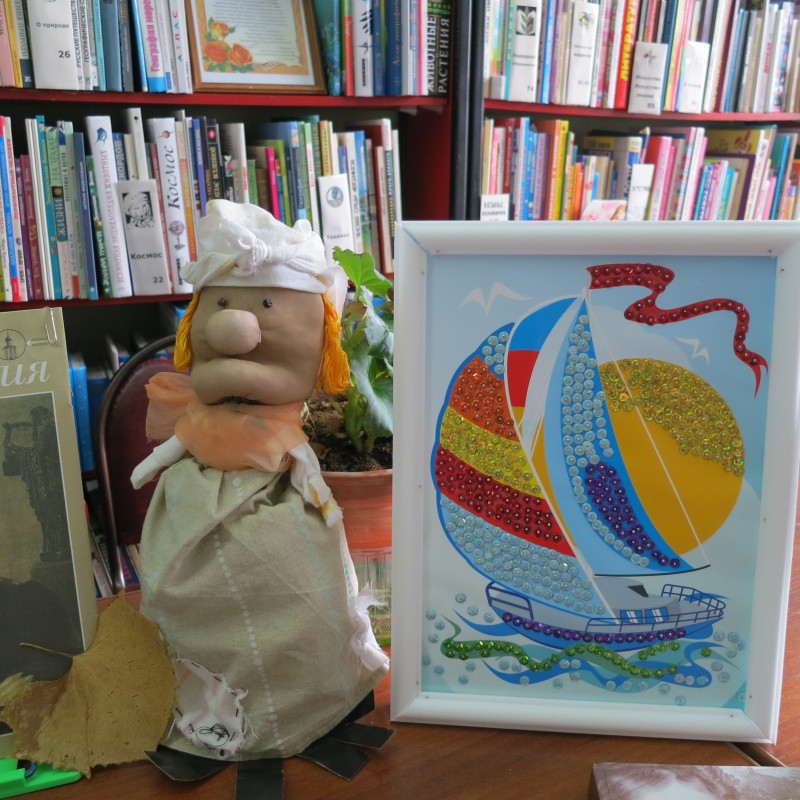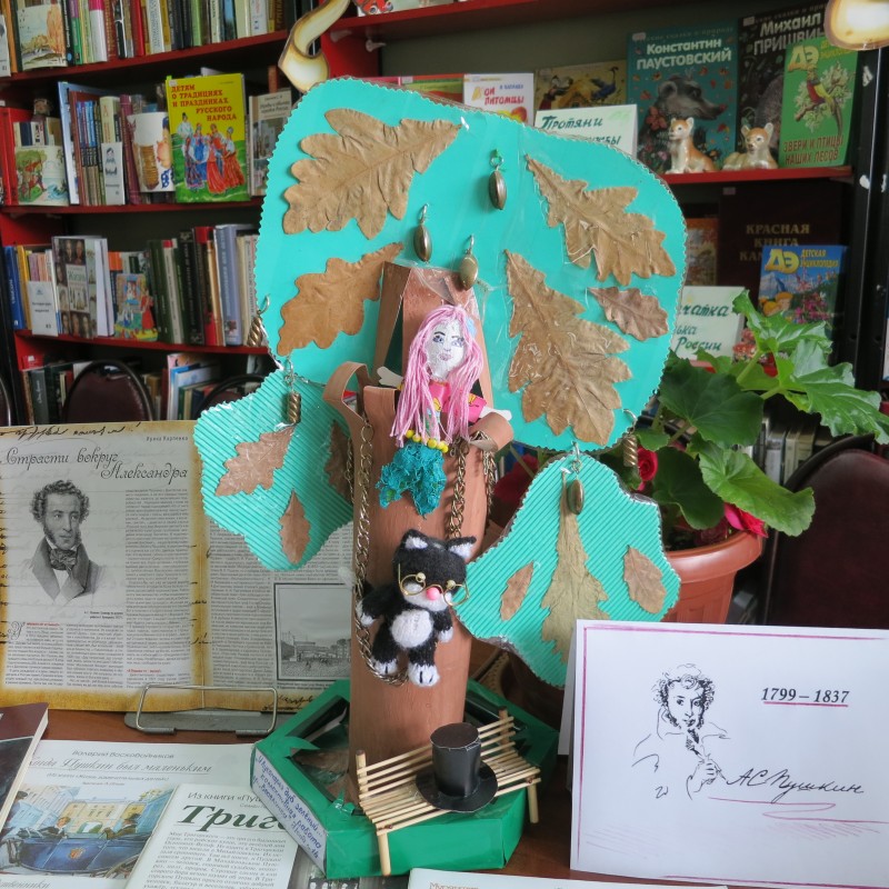 В течение дня для детей, которые посетили библиотеку,проводилась викторина «Под знаком Пушкина». Дети с удовольствием вспоминали сказки Пушкина, отвечали на вопросы викторины,угадывали его стихотворения. А на выездном заседании клуба «Сказка в красках» в Детский сад №16, группу «Веселинка» мы с ребятами и воспитателями выполнили коллективные работы «У Лукоморья дуб зелёный», «Баба Яга» и «Садко». Замечательные работы, полные волшебства и чудес украсили нашу книжную выставку.