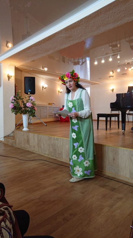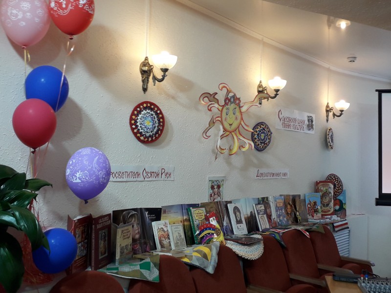 Во все времена деятельность библиотек была немыслима без тесной связи со школами, дошкольными образовательными учреждениями и учреждениями дополнительного образования. Библиотека №9 имеет свои традиции, опыт общения с читателями разных категорий: от малыша до его родителей, от ученика до его учителя. Совместные мероприятия получаются интересными, зрелищными и представляются совершенно в другом свете. Так 17 мая в зале детской музыкальной школы №5 прошло мероприятие под названием «Славянский венок», ко Дню славянской письменности и культуры. Вместе со славянкой, сказочными героями, музыкой и песнями наши гости путешествовали по удивительной Стране знаний. Узнали, откуда пошла славянская письменность, кто такие братья Кирилл и Мефодий, историю создания азбуки, письменности, первых книг и библиотек. Наш славянский венок играл яркими красками и благоухал свежим ароматом музыки и нежных цветов. Ребята, родители, преподаватели с удовольствием участвовали в занимательных играх и конкурсах. Оформление мероприятия - электронная презентация «Солунские братья» и развёрнутая книжная выставка «Славянский венок, чтение, культура». Но и выставка была не простая, украшали её предметы русского быта, изготовленные нашими мастерицами. Это и поделки из соломки, покрывала и накидки в лоскутной технике, вышитые подзоры и полотенца. Особый колорит нашему празднику придали русские наряды, в которых были все участники.