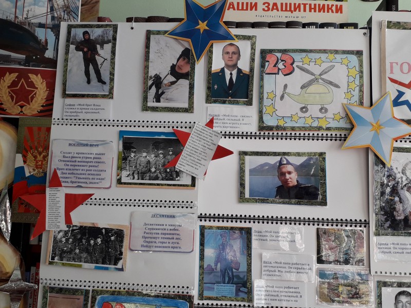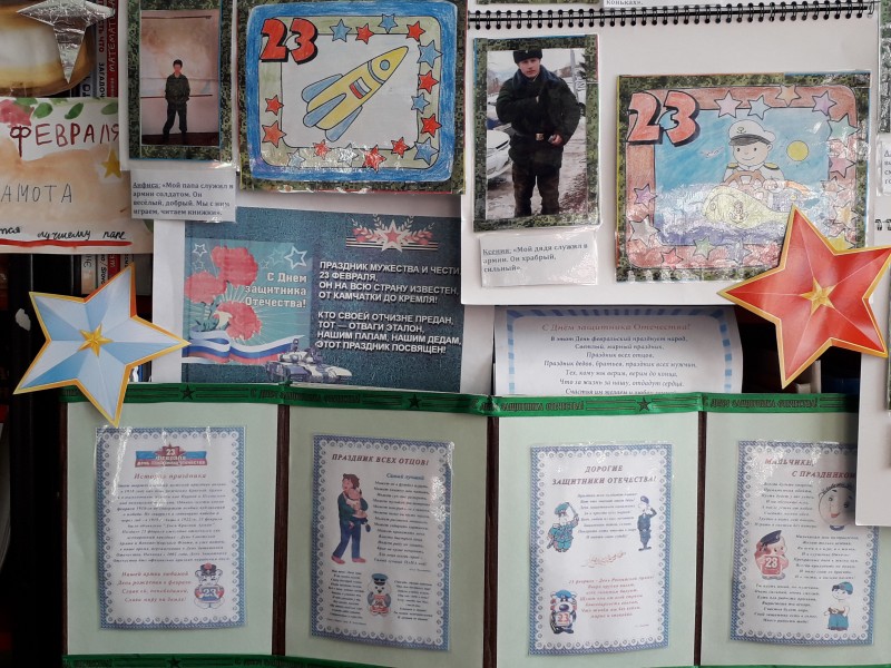 В читальном зале библиотеки совместно с Детским садом №50 оформлен необыкновенный, красочный коллаж « Папа гордость моя!». Фотографии пап, братьев, дедушек, оформленные стихотворениями, трогательными высказываниями, детскими рисунками. Рассказывая о своих работах, дети отмечали, что их папы самые замечательные, сильные, ловкие, как они гордятся и любят своих пап. Все читатели без исключения, с неподдельным восторгом глядя на эту выставку, испытывали глубокие чувства патриотизма за наших защитников.