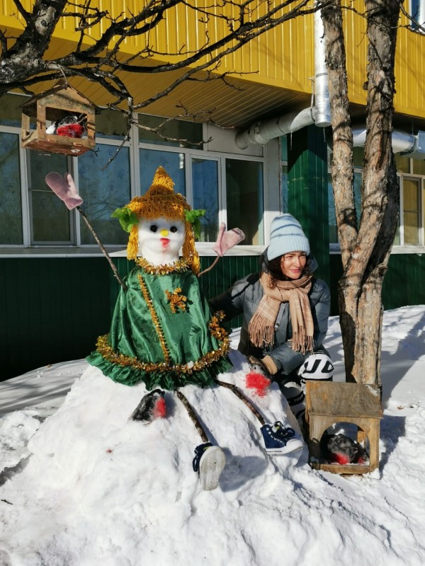 Задача, поставленная организаторами конкурса, нами была выполнена: героиня изображена в добром призыве кормить птиц зимой, бережно относится ко всему живому. К слову сказать, снегири так же были сделаны из снега. Вокруг композиции был построен лабиринт снежного городка, в котором ребята участвовали в спортивных состязаниях и отгадывали загадки о природе.