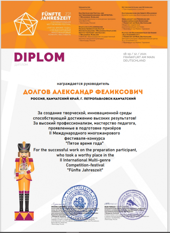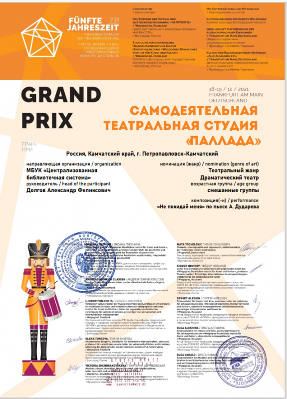 Мы уже делились с вами, дорогие друзья, своими успехами, однако в канун Рождества получили письмо и наградные документы от организаторов II МЕЖДУНАРОДНОГО МНОГОЖАНРОВОГО КОНКУРСА-ФЕСТИВАЛЯ «ПЯТОЕ ВРЕМЯ ГОДА», проходившего в немецком Франкфурте-на-Майне. Напомним, театральный коллектив «Паллада», созданный на базе Центральной библиотеки и состоящий из наших читателей, в декабре 2021 года принял участие в этом знаковом событии и завоевал Гран-При в номинации «Театральный жанр. Драматический театр».