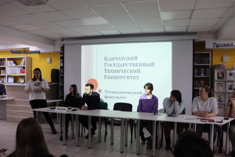 Первой на встрече выступила курсант Камчатского государственного технического университета Александра Горбанева. Эта стройная девушка отличается мужским характером. Она учится на мореходном факультете. Александра рассказала, что она единственная девушка на курсе и ее будущая специальность связана с обслуживанием техники на кораблях. Рассказала о преимуществах обучения на мореходном факультете, какие льготы существуют для курсантов. Продолжили представлять Камчатский технический университет студентка технического факультета Дарья Антонова и студент факультета информационных технологий Денис Быков . Дарья поделилась со слушателями внеучебными мероприятиями, проводимыми в их родной альма-матер. Как выяснилось, их немало. Это и бесплатные кружки, и спортивные секции, концерты и студенческие капустники, конкурсы и игры. Денис рассказал о том, что, поступив на факультет информационных технологий, открыл для себя новое призвание. Он выступает звукорежиссером всех мероприятий, которые проходят при университете.