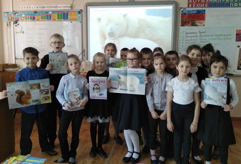 Следующими в гости отправились юные натуралисты из 2«Б». Библиотекарь не только поведала об уникальности белого медведя, но и познакомила с познавательными детскими журналами, на страницах которых можно найти ответы на вопросы о жизни в царстве холода.