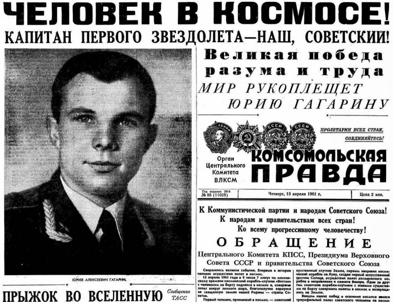 12 апреля эфир взорвали сообщения «Человек в Космосе!». Люди выходили на улицы, смотрели в небо, раскупали газеты с последними сообщениями. На улицах останавливалось автомобильное движение. Новости пестрили заголовками «Россия выигрывает соревнования», «Корабль Восток несёт майора Гагарина в историю». Полёт Гагарина называли эпохальным достижением человечества.