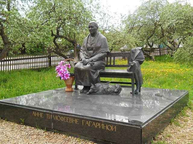 Памятник Анне Тимофеевне Гагариной расположен во дворе мемориального Дома-музея школьных лет Юрия Гагарина в г. Гагарин. У него интересная судьба: в 2000 году первый президент Республики Саха (Якутия) (главы республик тогда именовались президентами) Михаил Ефимович Николаев приехал в г. Гагарин по вопросам строительства гранильного завода. Конечно же, прежде всего он посетил Дом-музей Гагарина, затем с сопровождающими его лицами выехал в деревню Клушино, чтобы посетить могилу матери знаменитого космонавта. Он был поражен тем, что могила была более чем скромная, и принял решение установить памятник Анне Тимофеевне. Не откладывая дело в долгий ящик, он вызвал из Якутска скульптора Эдуарда Пахомова и предложил ему поработать над достойным увековечиванием Матери. Был объявлен всероссийский конкурс, в котором первое место получил эскиз Пахомова, к тому времени уже хорошо продумавшего идею памятника. На следующий год уже был торжественно открыт памятник Анне Андреевне – прекрасное произведение монументальной скульптуры, покоряющее достоверностью образа, лаконичностью форм и глубиной психологического содержания.