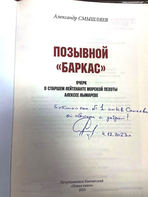 2. Смышляев, А А. Позывной " Баркас": очерк о старшем лейтенанте морской пехоты Алексее Лымареве / А. А. Смышляев.- Петропавловск - Камчатский: Новая книга, 2023.- 80с. - ( Честь и слава Камчатки)