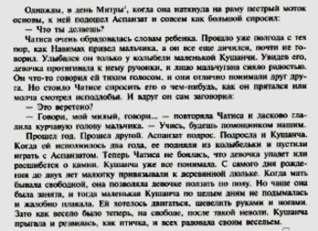 Это прекрасная историческая повесть, написанная, в первую очередь, для подрастающего поколения. Герой повести – древние урарты и ассирийцы. У автора явно есть свои исторические предпочтения. Она хоть и не в восторге от царя урартов Русы, его наместников и военачальников, но всё-таки ее симпатии явно на стороне тружеников урартов. А ассирийцы – дикие, коварные и жестокие. Книги вообще написана очень талантливо, и рассказывается в ней о жизни талантливых людей, добывающих свой нелегкий и очень скудный хлеб тяжелым физическим трудом. А когда они попадают в рабство в Ассирию, то живут в страшных нечеловеческих условиях, ежедневно подвергаясь мучениям и казням, но их талант вечен, и созданное ими живет и сейчас. Главные герои этой книги – урарты бронзовых дел мастер Аплай, его сын Аблиукну и внук Таннау, каменотес Габбу, киммер Рапаг, а также простые пастухи, землепашцы, воины и многие другие.