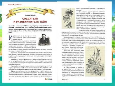 Зиман, Леонид. Создатель и разоблачитель тайн : к 165 – летию Роберта Льюиса Стивенсона / Леонид Зиман // Читайка и его друг Совёнок : ежемесячный журнал для детей младшего школьного возраста. – 2015 (105). – № 11.– С. 30 – 33. – (Юбилей писателя).