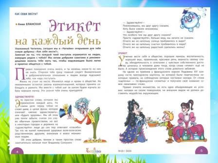 Прочитав статью «Этикет на каждый день», опубликованную на страницах журнала «Читайка и его друг Совёнок», читатели узнают о значении слова «Здравствуйте», а также о том, как правильно приветствовать друг друга. Кроме того, статья знакомит читателей с правилами русского этикета, изложенными в книге «Юности честное зерцало», а также с происхождением многих «волшебных» слов.