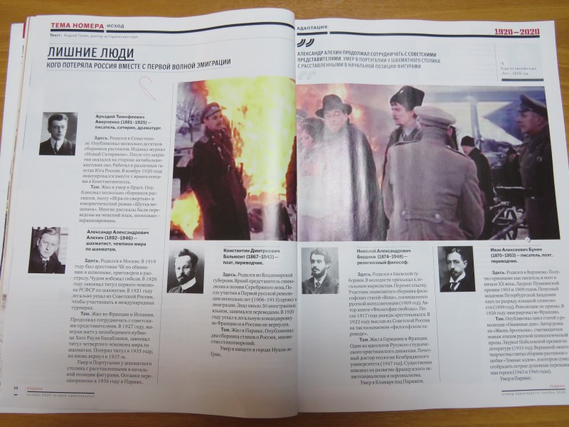 Главная тема номера – Исход, раскрывается в нескольких статьях, посвященных эмиграции из Советской России. Доктор исторических наук Андрей Ганин рассказывает об эвакуации остатков армии барона Врангеля из Крыма, приводит свидетельства очевидцев, а в статье «Лишние люди» он же кратко повествует о судьбе тех, кого потеряла Россия вместе с первой волной эмиграции. Это такие известные люди, как писатель Аркадий Аверченко, чемпион мира по шахматам Александр Алехин, поэт Константин Бальмонт, писатели Иван Бунин, Александр Куприн, Дмитрий Мережковский, Владимир Набоков, Алексей Толстой; балерина Матильда Кшесинская, композитор Сергей Рахманинов, авиаконструктор Игорь Сикорский, художники Илья Репин и Марк Шагал и многие другие.