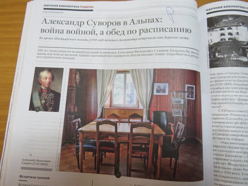 В материале Ольги Рачковской «Александр Суворов в Альпах: война войной, а обед по расписанию» говорится о том, как встречало нашего великого полководца местное население в Швейцарии. Его считали освободителем.