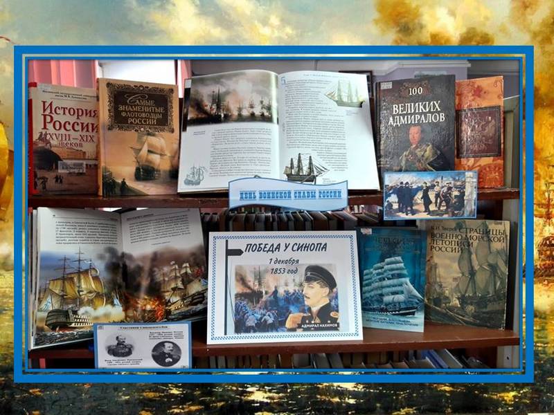 Библиотека № 5 подготовила книжную выставку «Победа у Синопа» и обзор литературы о Синопском сражении, а также о знаменитом флотоводце П. С. Нахимове.