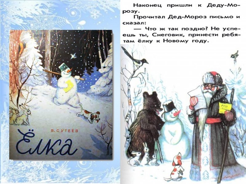«Какой Новый год без ёлки?» - подумали дети и написали письмо Деду Морозу. Ведь только Дедушка Мороз может прислать из леса самую пушистую ёлочку. Так начинается сказка Владимира Григорьевича Сутеева «Ёлка». Успеет ли Снеговик привезти детворе лесную красавицу? Конечно, успеет, но сколько препятствий ему предстоит преодолеть! В 1955 году по сказке "Ёлка" был снят мультфильм «Снеговик-почтовик».