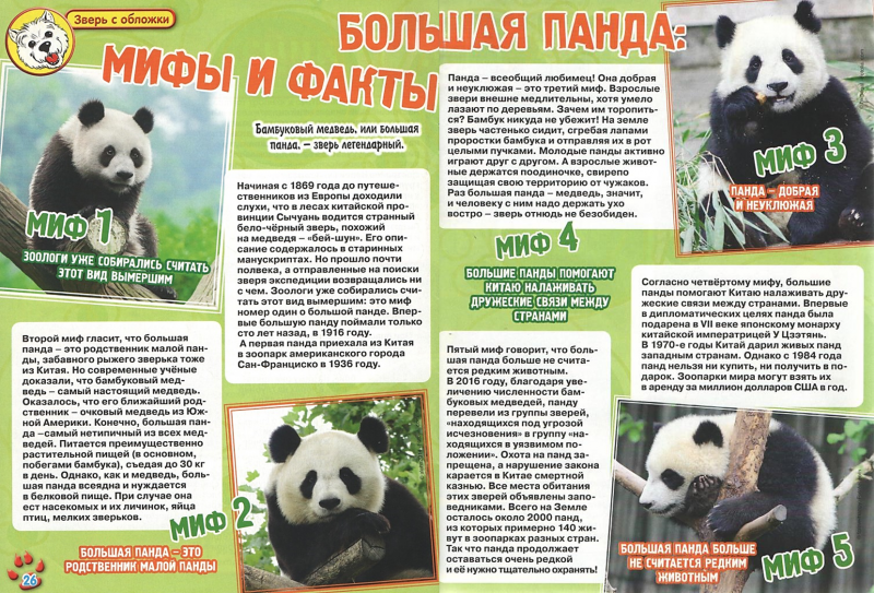 Большая панда : мифы и факты // Тошка и компания : весёлый журнал о животных. – 2017. – № 1. – С. 26-27. – (Зверь с обложки).