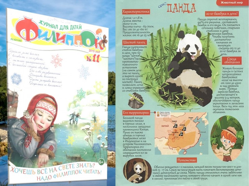 Ознакомившись со статьёй из журнала для детей «Наш Филиппок» читатель узнает о том, что слово «Большая панда» по-китайски означает – «Медведь кошка», где живут бамбуковые панды, о характеристиках и среде их обитания.