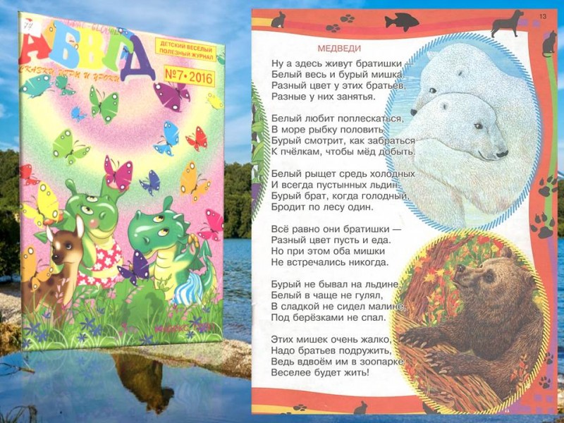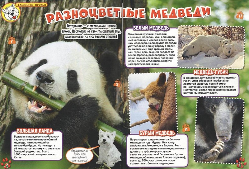 На страницах весёлого журнала о животных вы прочитаете удивительные истории о разных видах медведей обитающих на нашей планете Земля.