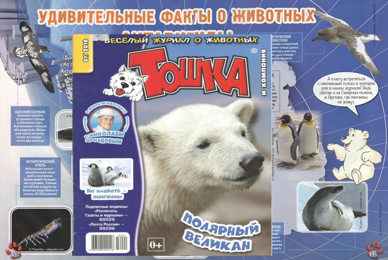 На страницах весёлого журнала о животных вы прочитаете об удивительных фактах животного мира Антарктиды. Ведь Антарктида покрыта многометровой толщиной льда, там очень холодно зимой: зимой – 60, а летом не выше 5 градусов. Как в таких условиях смогли приспособиться и жить животные вы узнаете на страницах журнала «Тошка».