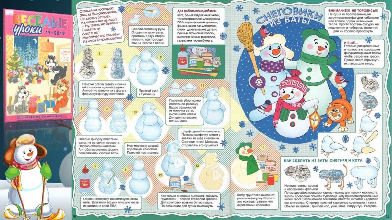 Снеговики из ваты // Весёлые уроки : детский познавательный журнал. – 2019. – № 12. – С. 30-31.