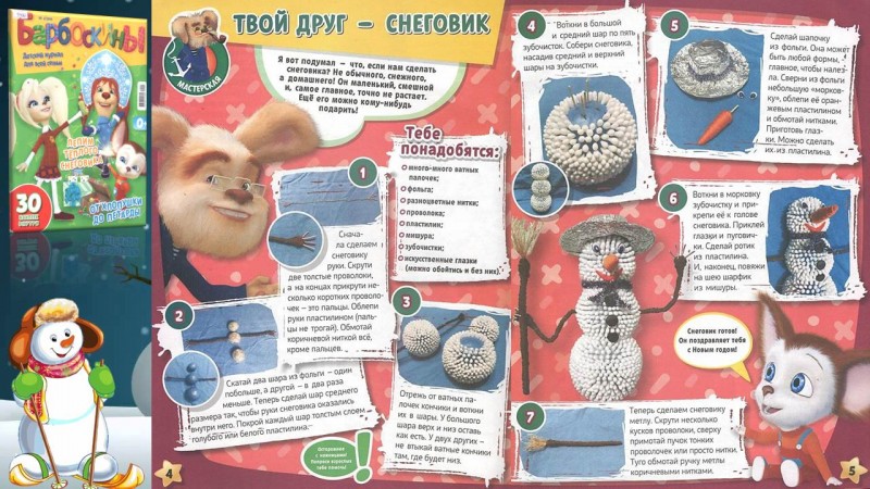 На страницах журнала «Барбоскины» представлен мастер-класс по изготовлению снеговика из ватных палочек своими руками. Ведь снеговика можно лепить не только из снега! Снеговичка можно сделать своего домашнего, маленького и смешного. И, самое главное, он точно не растает. Ещё его можно кому-нибудь подарить в качестве сувенира ко Дню рождения снеговика!