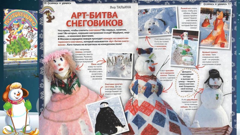 Тальина, Яна. Арт – битва снеговиков / Яна Тальина // Простоквашино : познавательно-развлекательный журнал для детей. – 2014. – № 1. – С. 16-17. – (Оглянись и удивись).