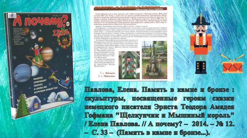В журнале "А почему?" Вы найдёте статью "Память в бронзе и камне" о памятниках Щелкунчику.