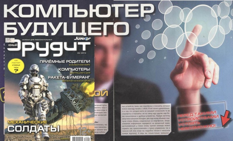 Прочитав статью из журнала «Юный Эрудит», вы узнаете о том, что смартфоны и планшеты – это уже, можно сказать, вчерашний день. Завтра мы будем подключаться к интернету… с помощью одежды и предметов домашнего обихода. А послезавтра научимся погружаться в виртуальную реальность, касаться несуществующих предметов и вдыхать заданные программой запахи. Технологическая революция набирает обороты!