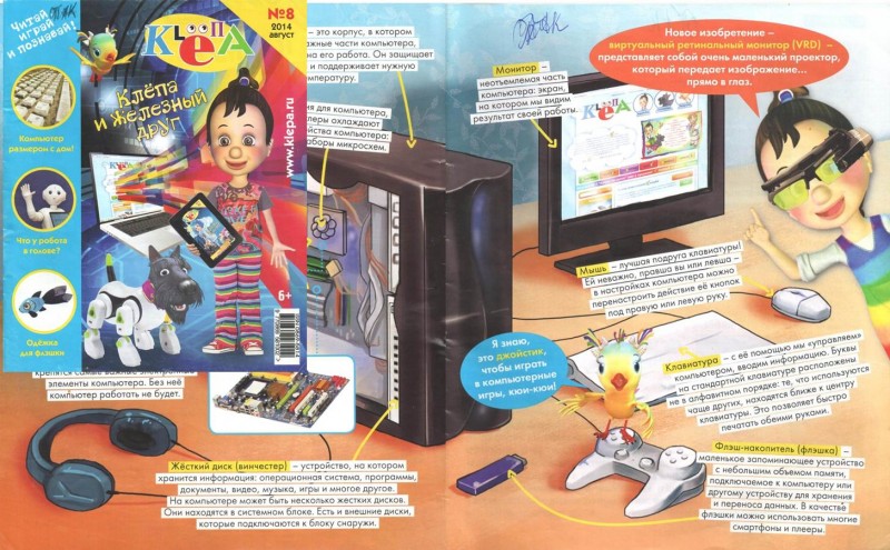 На страницах журнала «Клёпа» читатель найдёт интересную информацию о внутреннем содержании компьютера, о самом большом компьютере, самой новой разработке в компьютерном мире, о самом маленьком электронном устройстве – нанокомпьютере, о гаджетах будущего, о новом изобретении виртуального ретинального монитора.