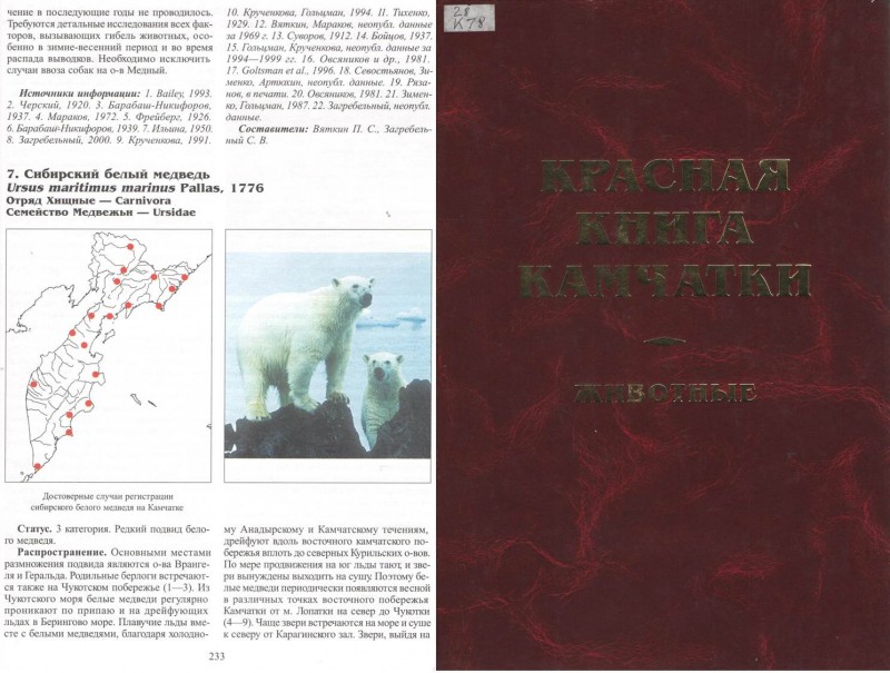 Сибирский белый медведь // Красная книга Камчатки : [энциклопедия в 2 т.] : Т. 1. Животные = Redd a book of Kamchatka. Vol. 1. Animals / Администрация Камчатской области, Администрация Корякского автономного округа, Камчатский филиал Тихоокеанского института географии ДВО РАН ; [коллектив авт. ; отв. ред. А. М. Токранов]. – Петропавловск-Камчатский : Камчатский печатный двор, 2006. – С. 233-234 с. : ил.